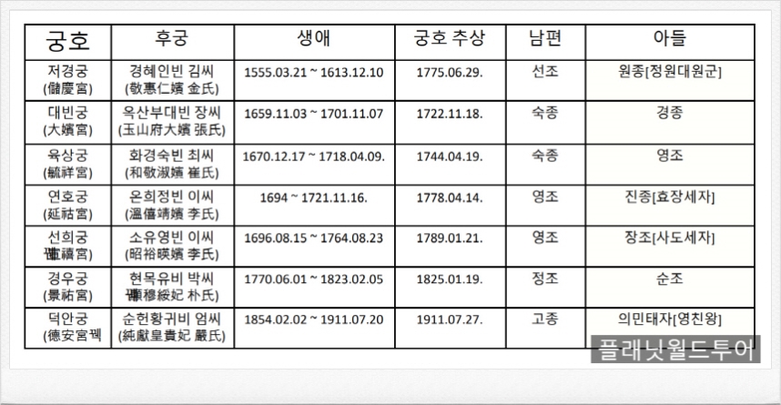 Á¶¼± »çȸ¿¡¼´Â ¿ÕÀ» ³ºÀº ¾î¸Ó´Ï¶óµµ ¿Õºñ°¡ ¾Æ´Ï¸é Á¾¹¦¿¡ ¸ð½Ç ¼ö ¾ø¾ú±â ¶§¹®¿¡, º°µµÀÇ »ç´çÀÌ ÇÊ¿äÇß°í, ±× °á°ú·Î Ä¥±Ã(öÒÏà)ÀÌ Çü¼ºµÇ¾ú½À´Ï´Ù. ¿ÕÀÇ »ý¸ð- ±¹¸ð(ÏÐÙ½)Áß ¿ÕÈķΠåºÀµÇÁö ¸øÇÑ Àι°µéÀÇ ½ÅÁÖ(ãêñ«)¸¦ ¸ð½Å »ç´çÀÌ´Ù. ¿µÁ¶(ÀçÀ§ 1724¡1776)¸¦ ³ºÀº ¼÷ºó ÃÖ¾¾(1670~1718)ÀÇ »ç´çÀÎ À°»ó±ÃÀÌ ¸ÕÀú µé¾î¼± µÚ 1908³â ¼øÁ¾½Ã±â ºÎÅÍ Àü±¹ °¢Áö¿¡ Èð¾îÀúÀÖ´ø »ç´çÀ» °æº¹±Ã ¼ÂÊ ÀÚ¸®·Î ¿Å°Ü ÅëÇÕÇØ Á¶¼º Ä¥±ÃÀÌ µÇ¾ú´Ù. ÇöÀç û¿Í´ë ¹Ù·Î ¿·¿¡ À§Ä¡ÇØ ÀÖ´Ù. Ä¥±ÃÀº Á¶¼±½Ã´ë »ç´çÀÇ °ÇÃà¸ð½À°ú Á¤Ä¡±¸Á¶¼Ó ¿Õ½Ç ¿©¼ºµéÀÌ Ã³ÇÑ Á¤Ä¡Àû¡¤½ÅºÐÀû ÇѰ踦 º¸¿©ÁÖ´Â µ¿½Ã¿¡ Á¦·¡¹®È¸¦ ÀÌÇØ ÇϱâÀ§ÇØ ¹æ¹®Çϸé ÁÁÀº °÷ÀÌ´Ù.
