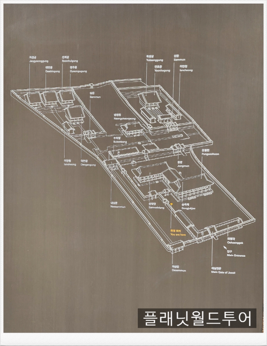 The first of these shrines was Yuksanggung, dedicated to Royal Consort Sukbin Choe (1670–1718), the mother of King Yeongjo (r. 1724–1776). Later, during the reign of Emperor Sunjong in 1908, several ancestral shrines that had been scattered across the country were relocated and consolidated on the western side of Gyeongbokgung Palace, creating the Chilgung complex as it stands today. It is now located right next to the Cheong Wa Dae.
